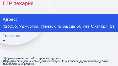ГТР, пекарня по адресу 426056, Удмуртия, Ижевск, площадь 50 лет Октября, 11 в дальнейшем Организация, размещена в следующих категориях: