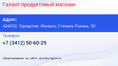 Галант, продуктовый магазин по адресу 426032, Удмуртия, Ижевск, Степана Разина, 50 в дальнейшем Организация, размещена в следующих категориях:
