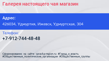 Галерея настоящего чая, магазин по адресу 426034, Удмуртия, Ижевск, Удмуртская, 304 в дальнейшем Организация, размещена в следующих категориях: