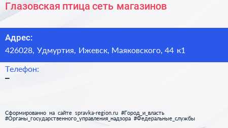 Глазовская птица, сеть магазинов по адресу 426028, Удмуртия, Ижевск, Маяковского, 44 к1 в дальнейшем Организация, размещена в следующих категориях: