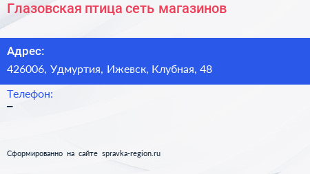 Глазовская птица, сеть магазинов по адресу 426006, Удмуртия, Ижевск, Клубная, 48 в дальнейшем Организация, размещена в следующих категориях: