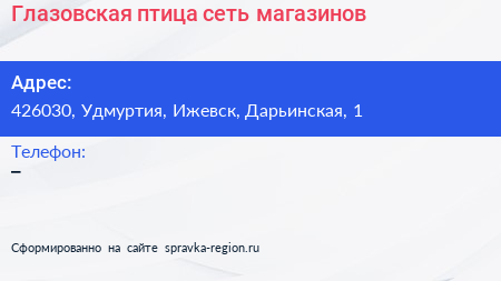 Глазовская птица, сеть магазинов по адресу 426030, Удмуртия, Ижевск, Дарьинская, 1 в дальнейшем Организация, размещена в следующих категориях: