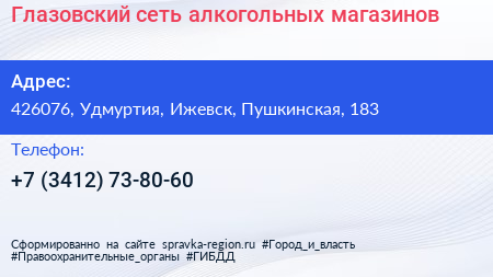 Глазовский, сеть алкогольных магазинов по адресу 426076, Удмуртия, Ижевск, Пушкинская, 183 в дальнейшем Организация, размещена в следующих категориях:
