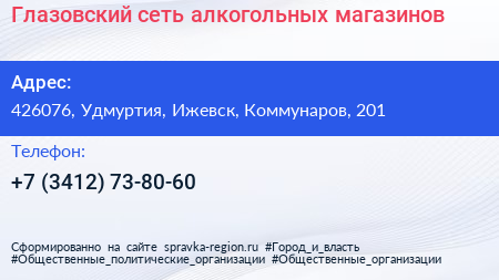 Глазовский, сеть алкогольных магазинов по адресу 426076, Удмуртия, Ижевск, Коммунаров, 201 в дальнейшем Организация, размещена в следующих категориях: