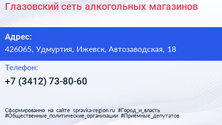 Глазовский, сеть алкогольных магазинов по адресу 426065, Удмуртия, Ижевск, Автозаводская, 18 в дальнейшем Организация, размещена в следующих категориях: