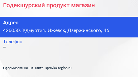 Годекшурский продукт, магазин по адресу 426050, Удмуртия, Ижевск, Дзержинского, 46 в дальнейшем Организация, размещена в следующих категориях: