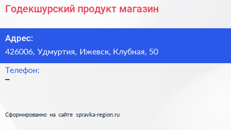 Годекшурский продукт, магазин по адресу 426006, Удмуртия, Ижевск, Клубная, 50 в дальнейшем Организация, размещена в следующих категориях: