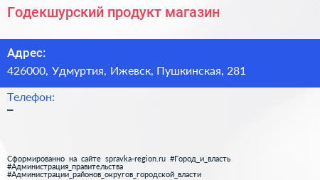 Годекшурский продукт, магазин по адресу 426000, Удмуртия, Ижевск, Пушкинская, 281 в дальнейшем Организация, размещена в следующих категориях: