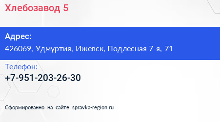 Хлебозавод №5 по адресу 426069, Удмуртия, Ижевск, Подлесная 7-я, 71 в дальнейшем Организация, размещена в следующих категориях:
