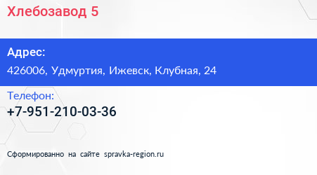 Хлебозавод №5 по адресу 426006, Удмуртия, Ижевск, Клубная, 24 в дальнейшем Организация, размещена в следующих категориях: