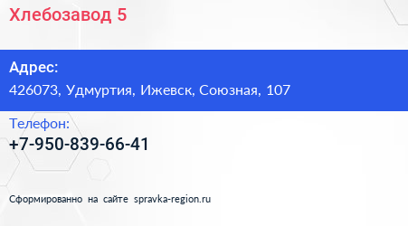 Хлебозавод №5 по адресу 426073, Удмуртия, Ижевск, Союзная, 107 в дальнейшем Организация, размещена в следующих категориях: