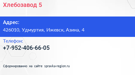 Хлебозавод №5 по адресу 426010, Удмуртия, Ижевск, Азина, 4 в дальнейшем Организация, размещена в следующих категориях: