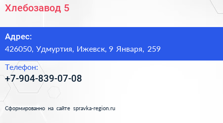 Хлебозавод №5 по адресу 426050, Удмуртия, Ижевск, 9 Января, 259 в дальнейшем Организация, размещена в следующих категориях: