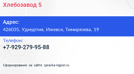 Хлебозавод №5 по адресу 426035, Удмуртия, Ижевск, Тимирязева, 19 в дальнейшем Организация, размещена в следующих категориях: