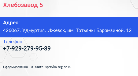 Хлебозавод №5 по адресу 426067, Удмуртия, Ижевск, им. Татьяны Барамзиной, 12 в дальнейшем Организация, размещена в следующих категориях: