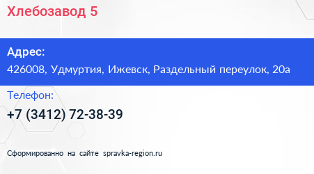 Хлебозавод №5 по адресу 426008, Удмуртия, Ижевск, Раздельный переулок, 20а в дальнейшем Организация, размещена в следующих категориях: