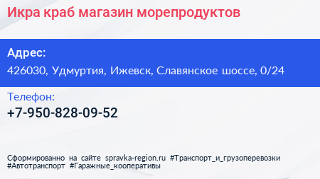 Икра-краб, магазин морепродуктов по адресу 426030, Удмуртия, Ижевск, Славянское шоссе, 0/24 в дальнейшем Организация, размещена в следующих категориях: