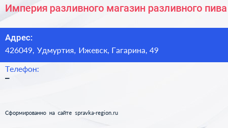 Империя разливного, магазин разливного пива по адресу 426049, Удмуртия, Ижевск, Гагарина, 49 в дальнейшем Организация, размещена в следующих категориях: