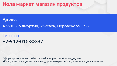 Йола-маркет, магазин продуктов по адресу 426063, Удмуртия, Ижевск, Воровского, 158 в дальнейшем Организация, размещена в следующих категориях: