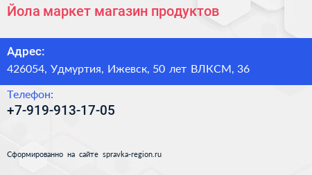 Йола-маркет, магазин продуктов по адресу 426054, Удмуртия, Ижевск, 50 лет ВЛКСМ, 36 в дальнейшем Организация, размещена в следующих категориях: