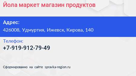 Йола-маркет, магазин продуктов по адресу 426008, Удмуртия, Ижевск, Кирова, 140 в дальнейшем Организация, размещена в следующих категориях: