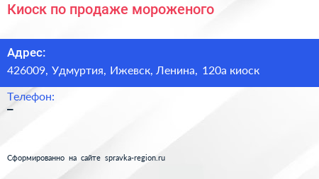 Киоск по продаже мороженого по адресу 426009, Удмуртия, Ижевск, Ленина, 120а киоск в дальнейшем Организация, размещена в следующих категориях: