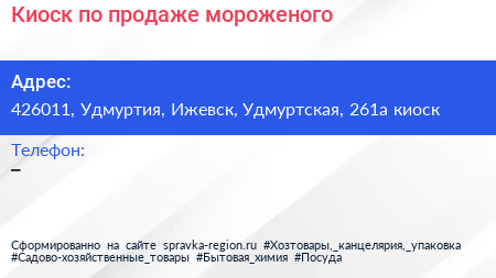 Киоск по продаже мороженого по адресу 426011, Удмуртия, Ижевск, Удмуртская, 261а киоск в дальнейшем Организация, размещена в следующих категориях: