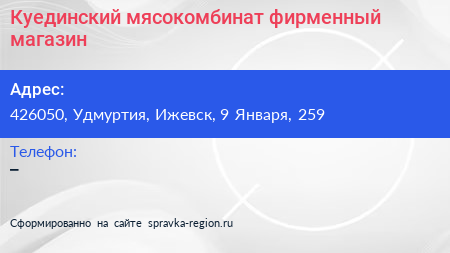 Куединский мясокомбинат, фирменный магазин по адресу 426050, Удмуртия, Ижевск, 9 Января, 259 в дальнейшем Организация, размещена в следующих категориях: