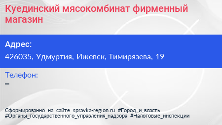Куединский мясокомбинат, фирменный магазин по адресу 426035, Удмуртия, Ижевск, Тимирязева, 19 в дальнейшем Организация, размещена в следующих категориях: