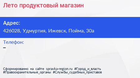 Лето, продуктовый магазин по адресу 426028, Удмуртия, Ижевск, Пойма, 30а в дальнейшем Организация, размещена в следующих категориях:
