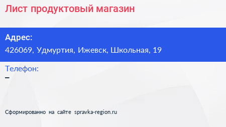 Лист, продуктовый магазин по адресу 426069, Удмуртия, Ижевск, Школьная, 19 в дальнейшем Организация, размещена в следующих категориях: