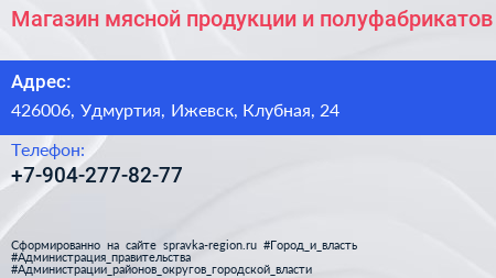 Магазин мясной продукции и полуфабрикатов по адресу 426006, Удмуртия, Ижевск, Клубная, 24 в дальнейшем Организация, размещена в следующих категориях: