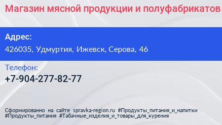 Магазин мясной продукции и полуфабрикатов по адресу 426035, Удмуртия, Ижевск, Серова, 46 в дальнейшем Организация, размещена в следующих категориях: