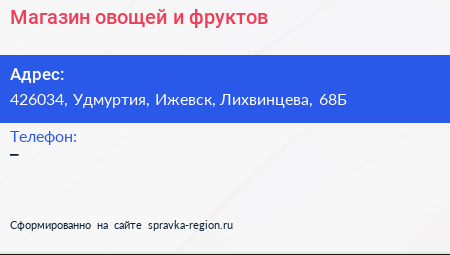 Магазин овощей и фруктов по адресу 426034, Удмуртия, Ижевск, Лихвинцева, 68Б в дальнейшем Организация, размещена в следующих категориях: