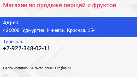 Магазин по продаже овощей и фруктов по адресу 426008, Удмуртия, Ижевск, Красная, 154 в дальнейшем Организация, размещена в следующих категориях: