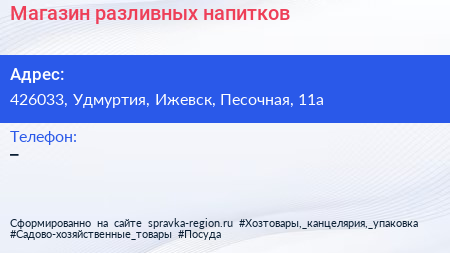 Магазин разливных напитков по адресу 426033, Удмуртия, Ижевск, Песочная, 11а в дальнейшем Организация, размещена в следующих категориях: