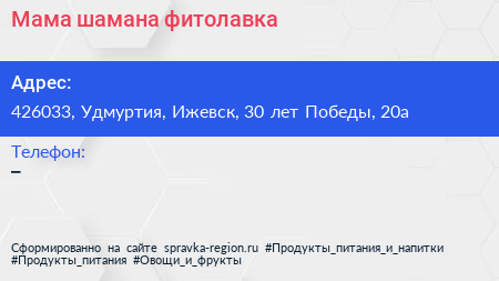 Мама шамана, фитолавка по адресу 426033, Удмуртия, Ижевск, 30 лет Победы, 20а в дальнейшем Организация, размещена в следующих категориях: