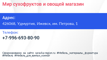 Мир сухофруктов и овощей, магазин по адресу 426068, Удмуртия, Ижевск, им. Петрова, 1 в дальнейшем Организация, размещена в следующих категориях: