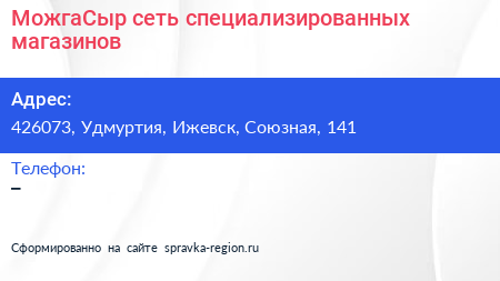 МожгаСыр, сеть специализированных магазинов по адресу 426073, Удмуртия, Ижевск, Союзная, 141 в дальнейшем Организация, размещена в следующих категориях: