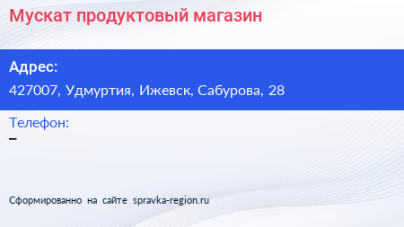 Мускат, продуктовый магазин по адресу 427007, Удмуртия, Ижевск, Сабурова, 28 в дальнейшем Организация, размещена в следующих категориях:
