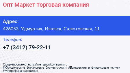 Опт Маркет, торговая компания по адресу 426053, Удмуртия, Ижевск, Салютовская, 11 в дальнейшем Организация, размещена в следующих категориях: