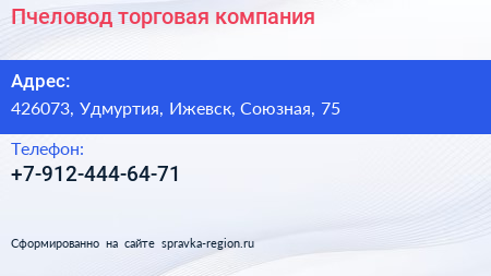 Пчеловод, торговая компания по адресу 426073, Удмуртия, Ижевск, Союзная, 75 в дальнейшем Организация, размещена в следующих категориях: