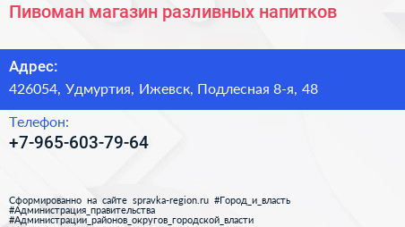 Пивоман, магазин разливных напитков по адресу 426054, Удмуртия, Ижевск, Подлесная 8-я, 48 в дальнейшем Организация, размещена в следующих категориях: