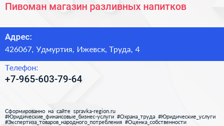 Пивоман, магазин разливных напитков по адресу 426067, Удмуртия, Ижевск, Труда, 4 в дальнейшем Организация, размещена в следующих категориях: