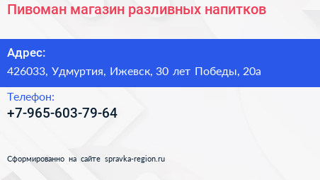 Пивоман, магазин разливных напитков по адресу 426033, Удмуртия, Ижевск, 30 лет Победы, 20а в дальнейшем Организация, размещена в следующих категориях:
