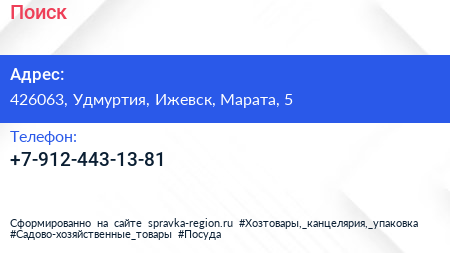 Поиск по адресу 426063, Удмуртия, Ижевск, Марата, 5 в дальнейшем Организация, размещена в следующих категориях: