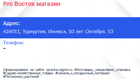 #Pro-Восток, магазин по адресу 426011, Удмуртия, Ижевск, 10 лет Октября, 53 в дальнейшем Организация, размещена в следующих категориях: