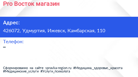 #Pro-Восток, магазин по адресу 426072, Удмуртия, Ижевск, Камбарская, 110 в дальнейшем Организация, размещена в следующих категориях: