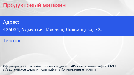 Продуктовый магазин по адресу 426034, Удмуртия, Ижевск, Лихвинцева, 72а в дальнейшем Организация, размещена в следующих категориях: