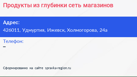 Продукты из глубинки, сеть магазинов по адресу 426011, Удмуртия, Ижевск, Холмогорова, 24а в дальнейшем Организация, размещена в следующих категориях: